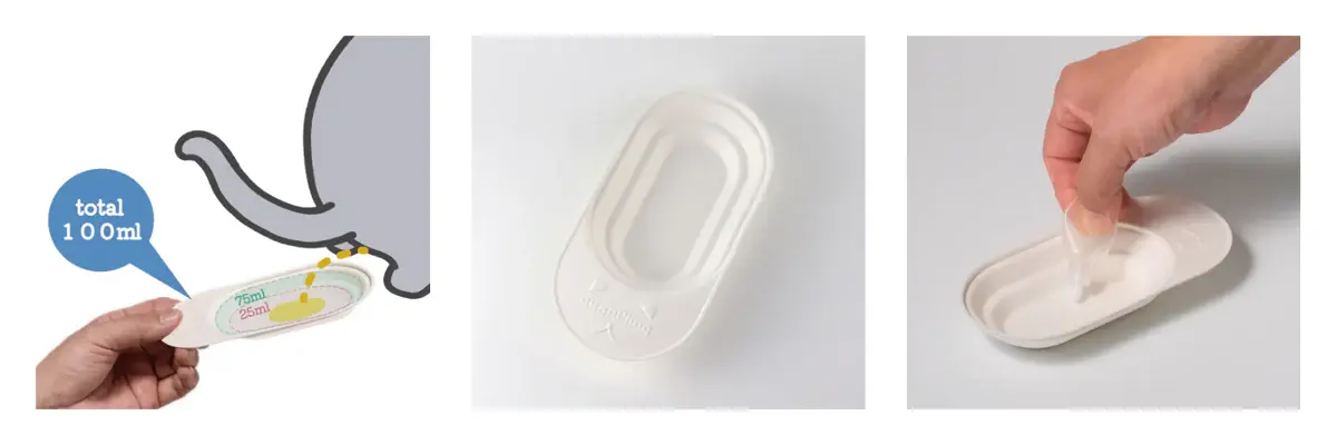 採尿器の素材は、プラスティックに替わるエコな成型品として注目されている、パルプモールドです。日本国内で生産しています。燃えるゴミとして簡単に捨てることができ、燃やしても有害物質が発生しません。